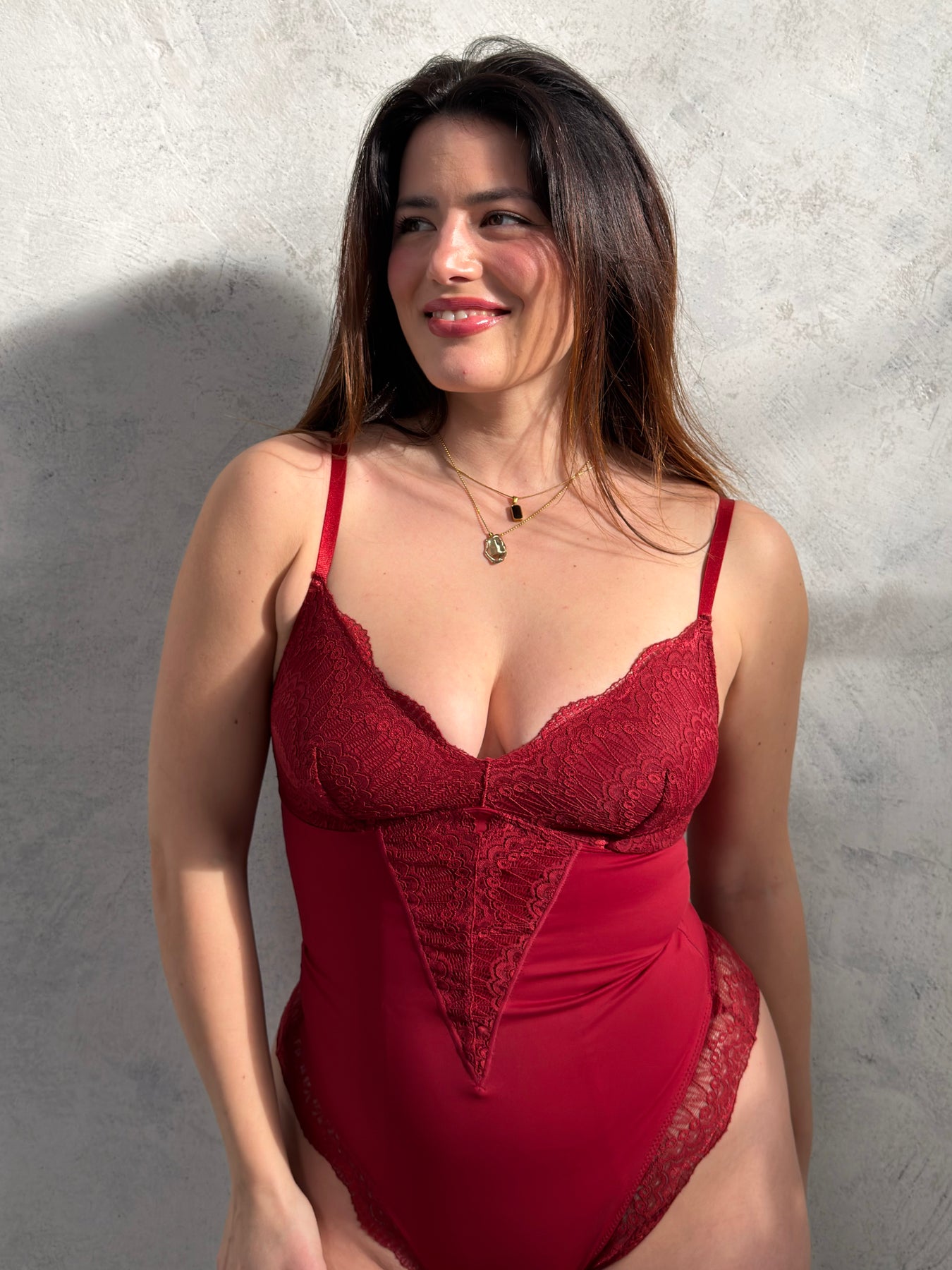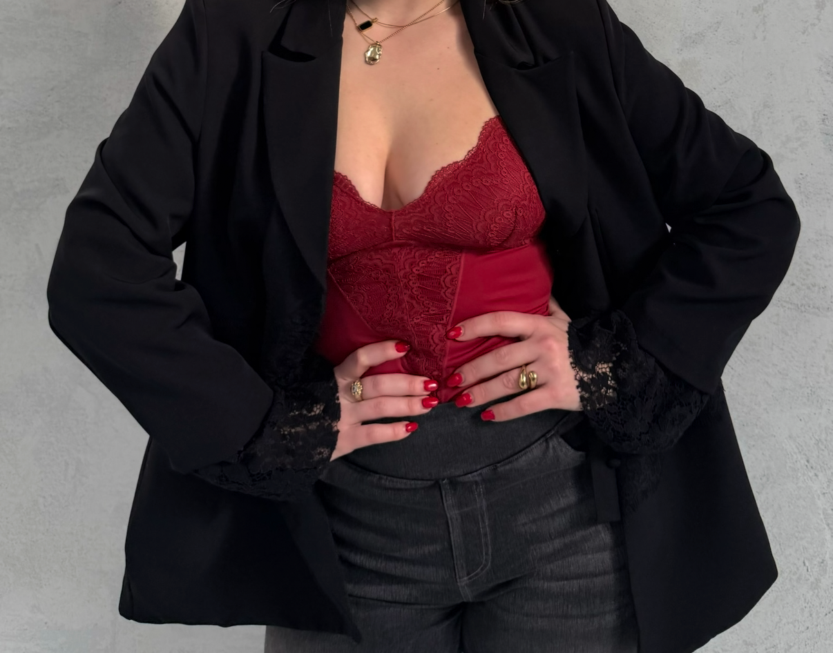 Body realizzato in pizzo rosso, progettato per unire design raffinato e struttura funzionale. Il pizzo delicato, abbinato a una tonalità intensa, dona al capo un’estetica curata ed essenziale, mantenendo una vestibilità confortevole e ordinata.